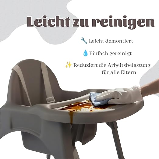 Auch die Reinigung der Hochstühle ist ein Kinderspiel: Das Sitzkissen lässt sich leicht abwischen oder, falls notwendig, abnehmen – so bleibt der Stuhl auch nach klebrigen Mahlzeiten schnell wieder sauber. Abgerundet wird die Sicherheit durch einen 5‑Punkt-Gurt, der dein Kind sicher im Sitz hält.